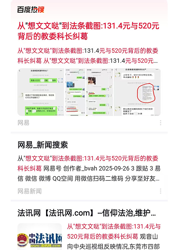 此前(2025年9月23日)报道了《从“想文文哒”到法条截图:131.4元与520元背后的教委科长纠葛》一文,披露了县教委一严姓科长在微信中发出“想文文哒”等亲密话语及含有131.4元、520元象征性红包的记录,引发对公职人员作风的广泛质疑。 在舆论发酵后,作者独家获得重大进展:县纪委监委驻县教委纪检监察组向作者明确回应:“韦小兰的举报材料,我们已知悉,目前正在按程序依纪依规处理中。” 这标志着事件已正式进入纪律审查程序。